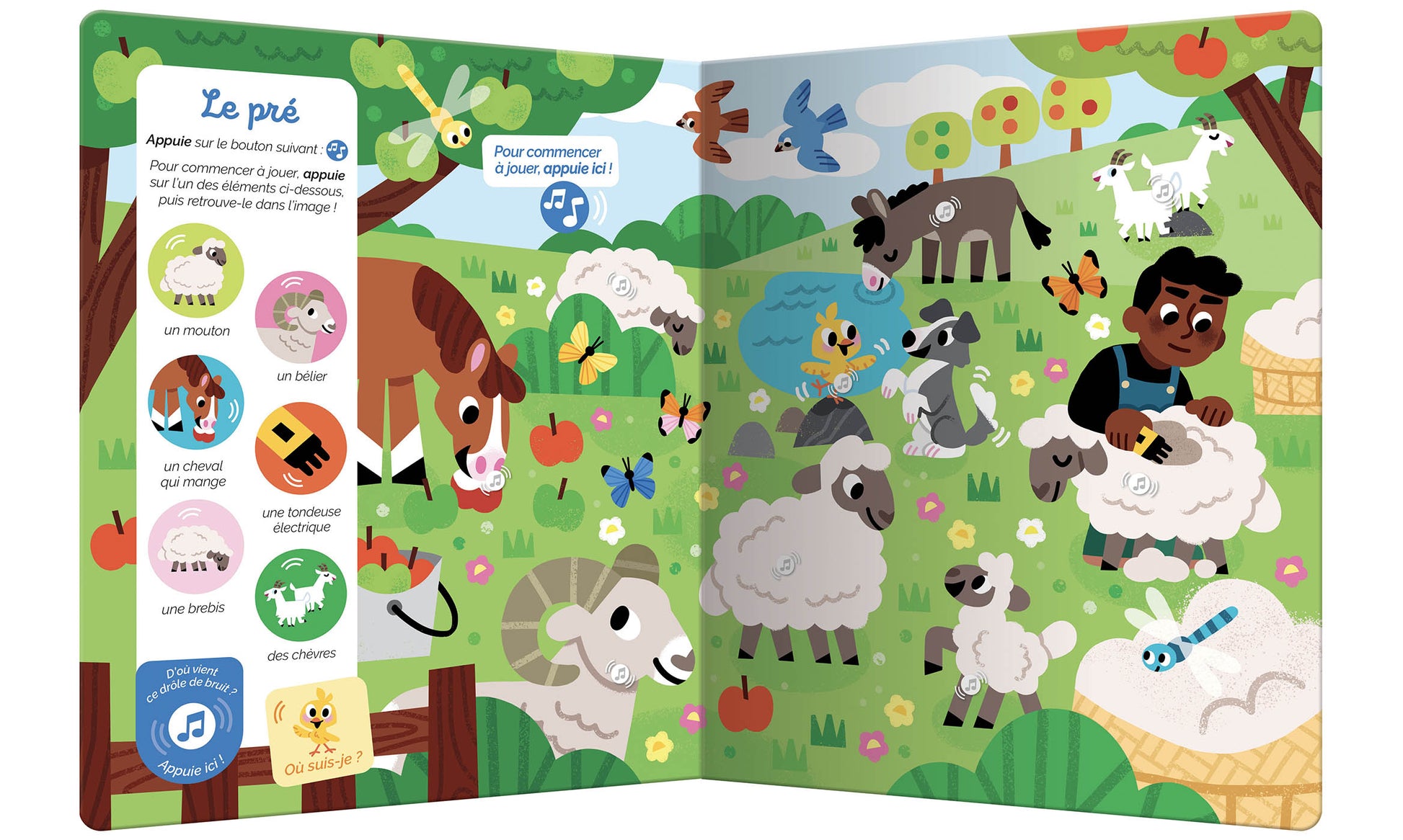 Sur chaque double-page, il observe et écoute attentivement pour retrouver 6 animaux et une mascotte qui se cache chacun des univers : la basse-cour, l'étable, le pré...