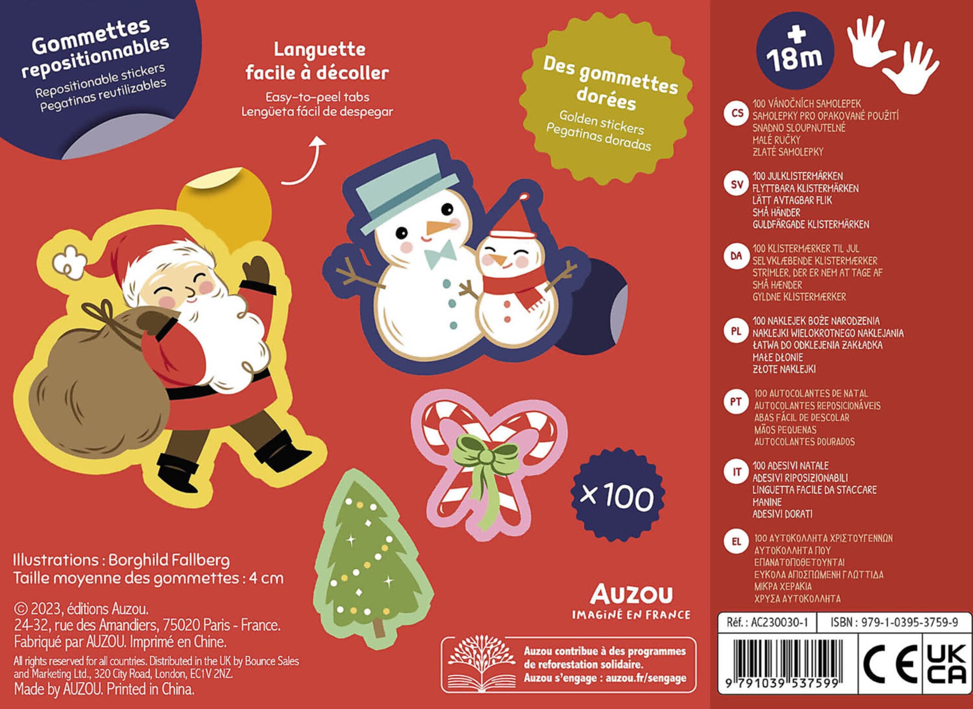 100 gommettes de Noël, repositionnables pour favoriser la créativité des enfants. Avec la grosse languette facile à décoller, les autocollants peuvent être utilisés en toute autonomie dès l’âge de 18 mois.
