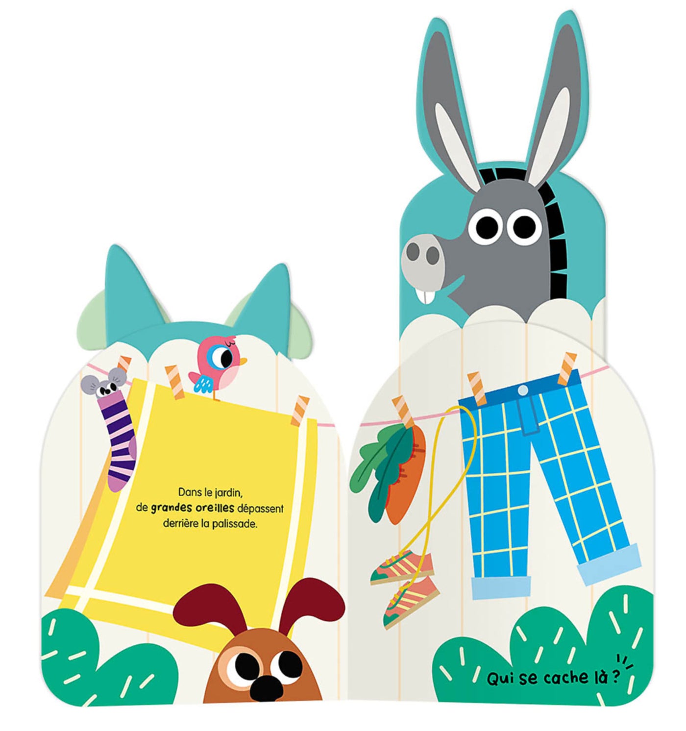 4 paires d’oreilles et 1 queue d’animal dépassent de ce livre animé en carte épaisse. Qui se cache là ?